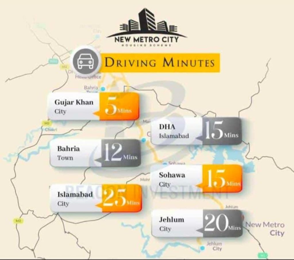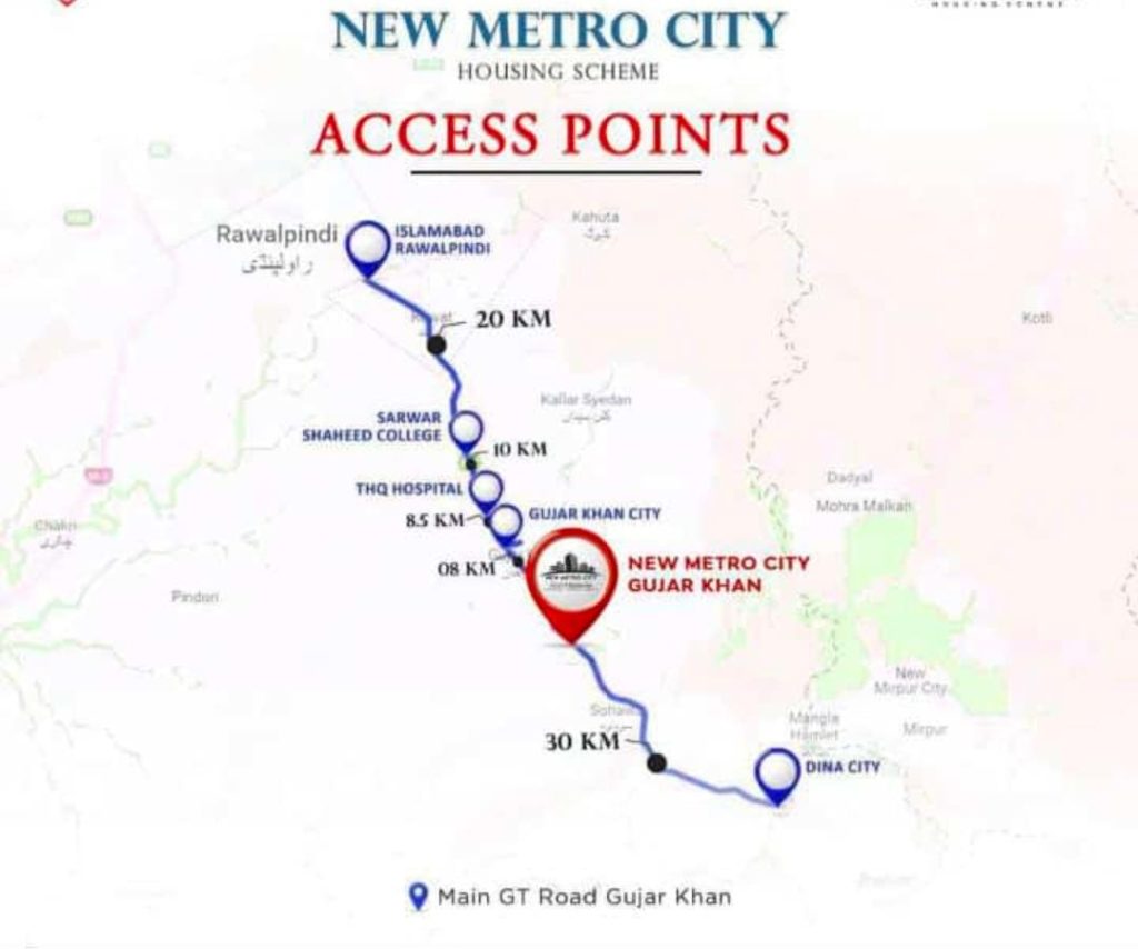 New Metro City Gujar Khan is ideally located on the main GT Road, just a few minutes from Gujar Khan City. Its prime location ensures easy access to Rawalpindi, Islamabad, and nearby towns, making it a convenient and strategic choice for residents and investors alike.