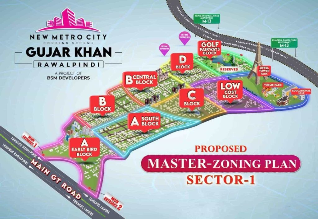 New Metro City Gujar Khan is a landmark housing project by BSM Developers, ideally located on the main GT Road, offering seamless access to Rawalpindi and Islamabad. Launched with the vision to provide modern living in a developing city, the project features world-class amenities, including wide roads, underground electricity, gated security, theme parks, schools, and commercial areas. Its affordability, prime location, and fast-paced development have made it one of the most successful real estate ventures in the region, attracting both local and overseas investors.