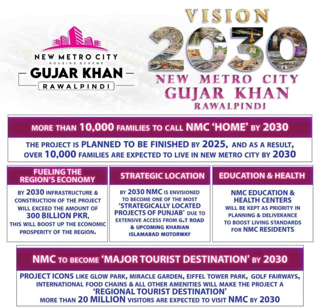 New Metro City Gujar Khan in Rawalpindi is set to become a vibrant hub by 2030, offering homes to more than 10,000 families. Scheduled for completion by 2025, the project aims to foster a thriving community. With a strategic location accessible via G.T. Road and the upcoming Kharian Islamabad Motorway, NMC is poised to be one of Punjab’s most well-connected developments.