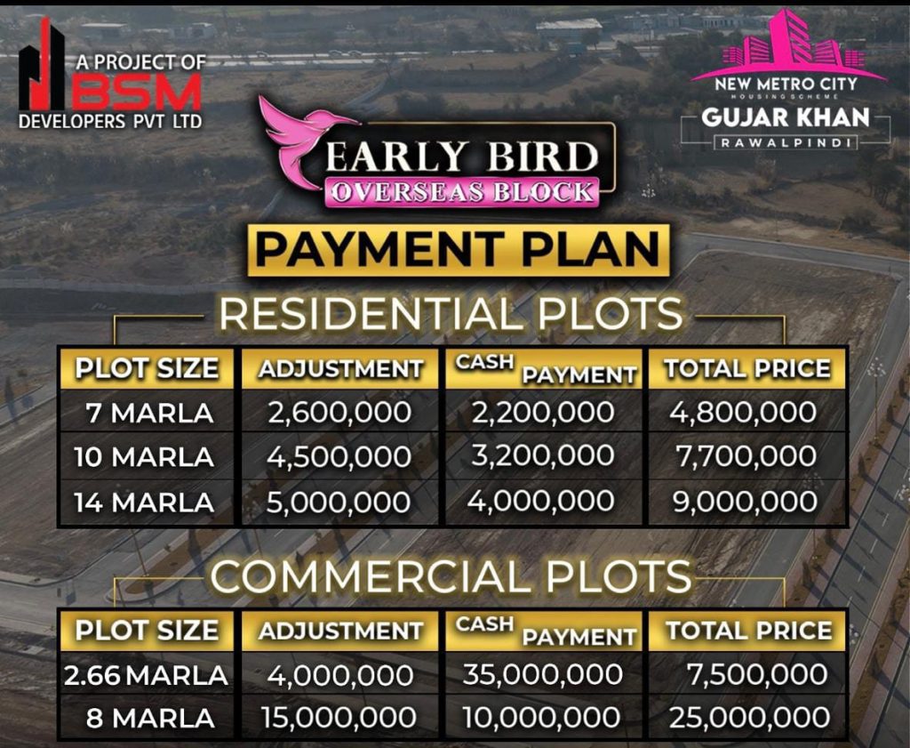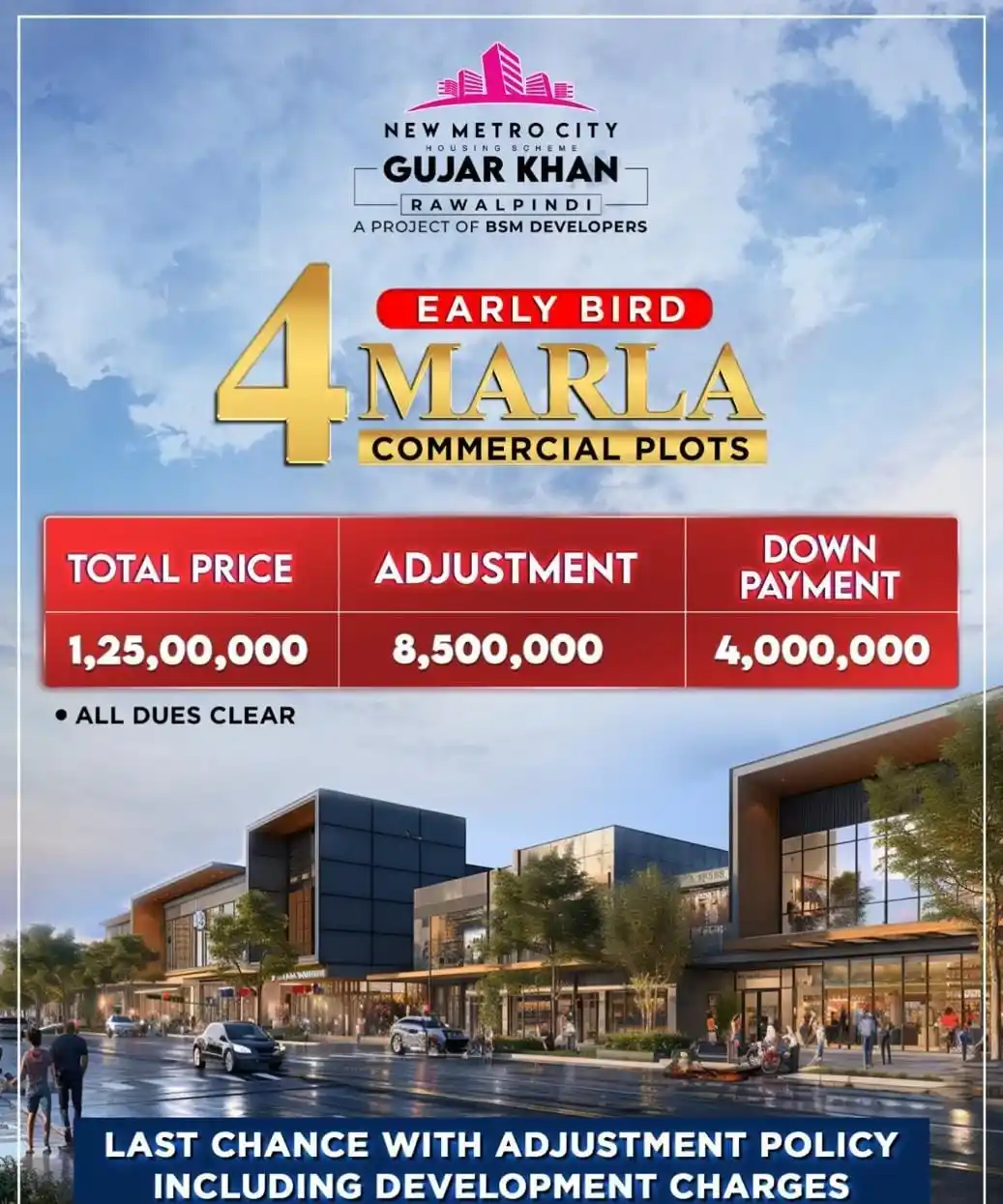 Seize the unique opportunity to own a 4 Marla commercial plot in the prestigious New Metro City Gujar Khan, a flagship project by BSM Developers. With an early bird offer, this is your last chance to avail of the adjustment policy, which includes development charges, ensuring all dues are clear.