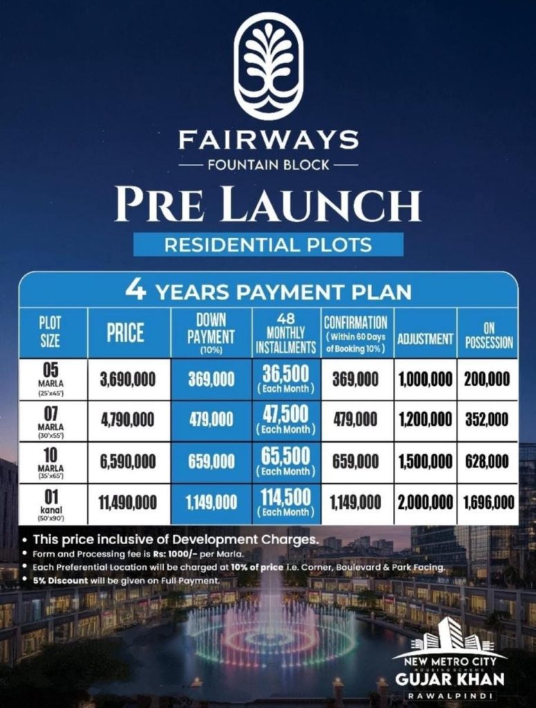 The block combines modern living with aesthetic appeal, offering both residential and commercial plot options at highly affordable rates under the slogan “Big Dreams, Small Payments.” With flexible installment plans, scenic surroundings, and a prime location near key landmarks such as Sarwar Shaheed College and Tehsil Headquarters Hospital, Fairways Fountain Block is ideal for families, investors, and overseas Pakistanis seeking quality living with strong future returns.